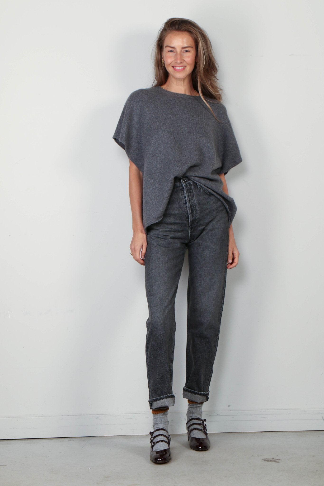 - Het model is 1.73m lang en draagt maat 25