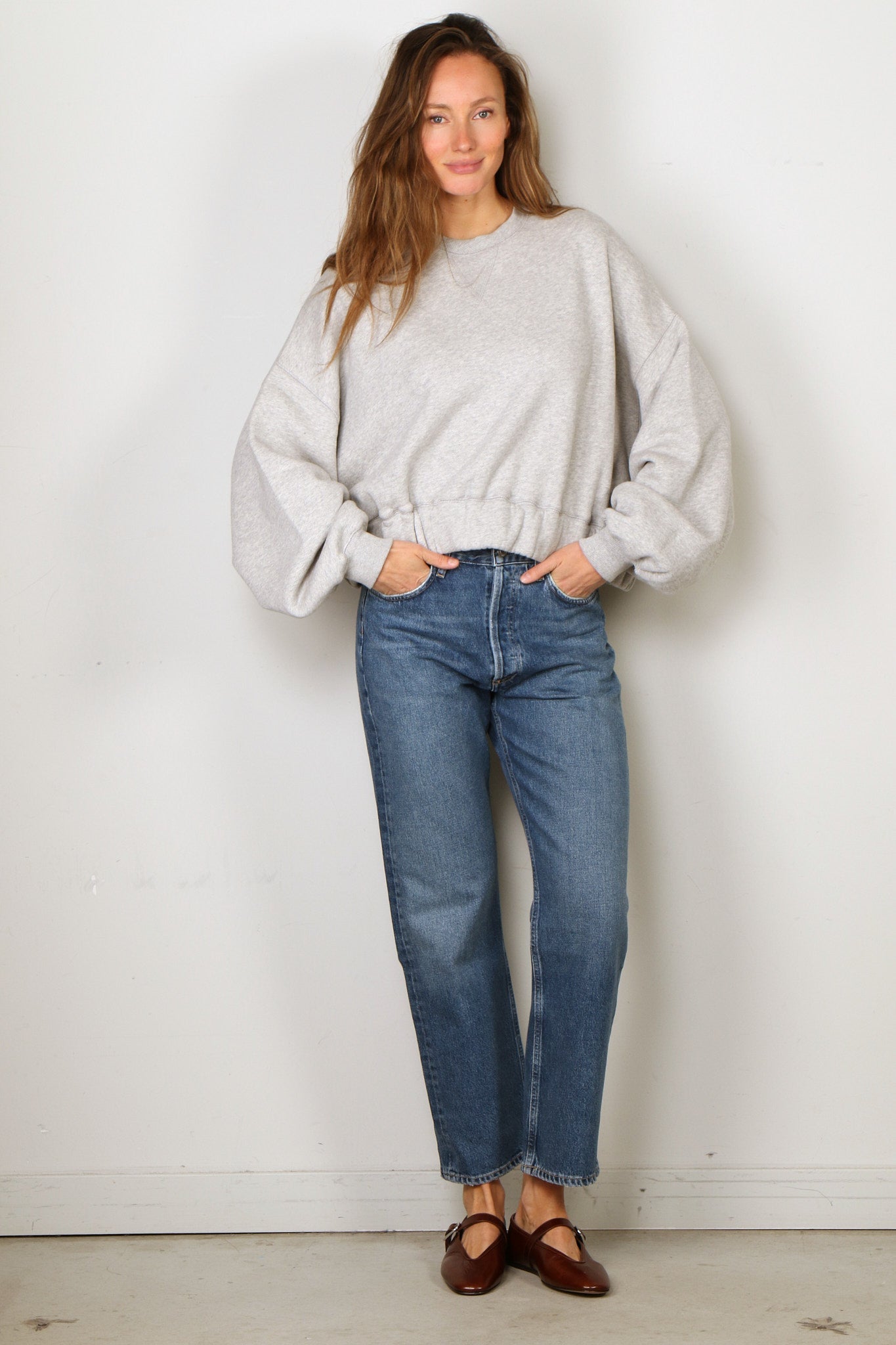 Heidi brings cozy sophistication to your wardrobe. With its oversized fit, voluminous sleeves, and cropped elastic hem, this grey melange sweater combines comfort and style.