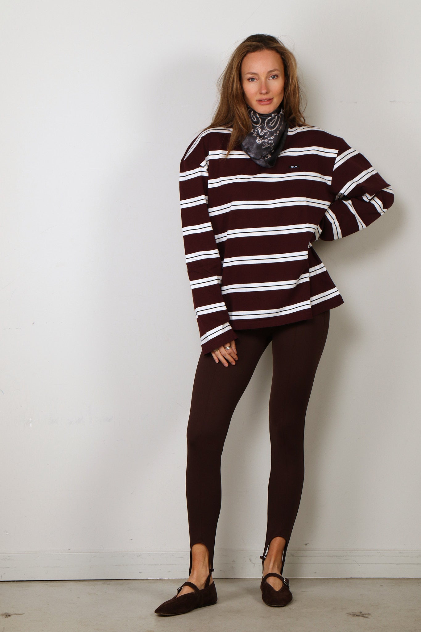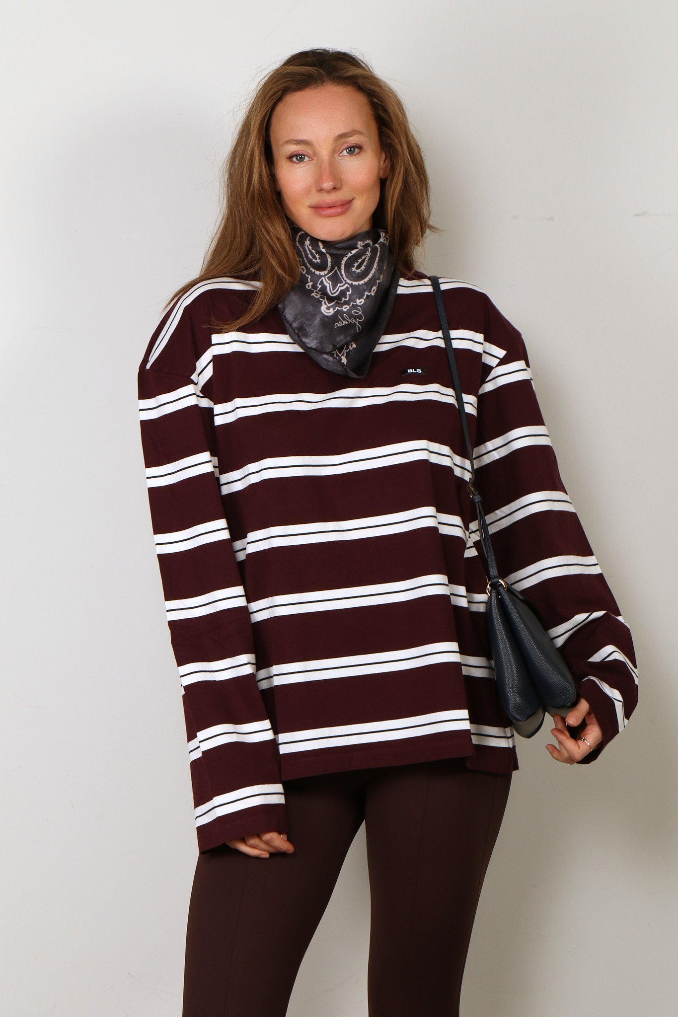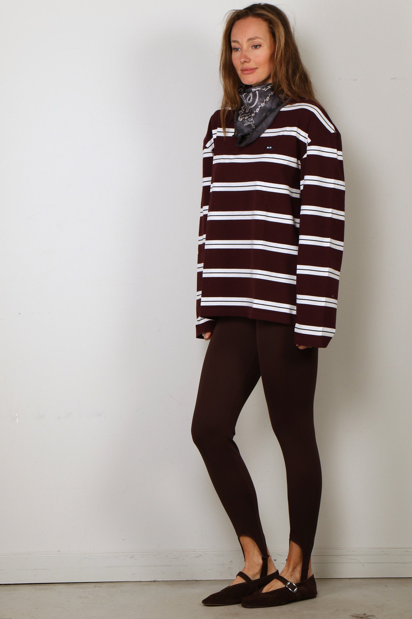 An oversized longsleeve with a custom burgundy, navy, and white stripe that makes a statement without trying too hard.