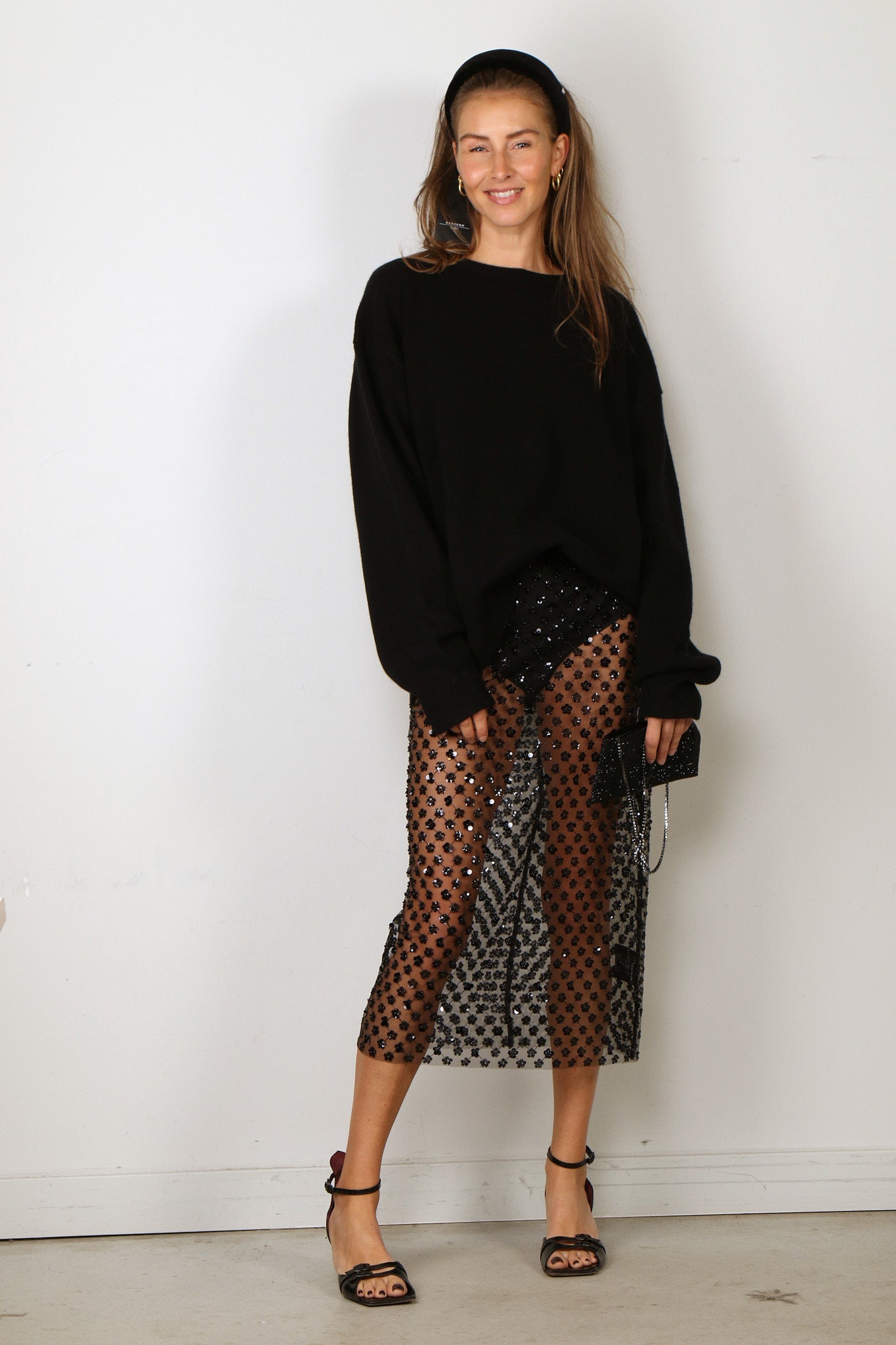 - Het model is 1.73m lang en draagt de One Size