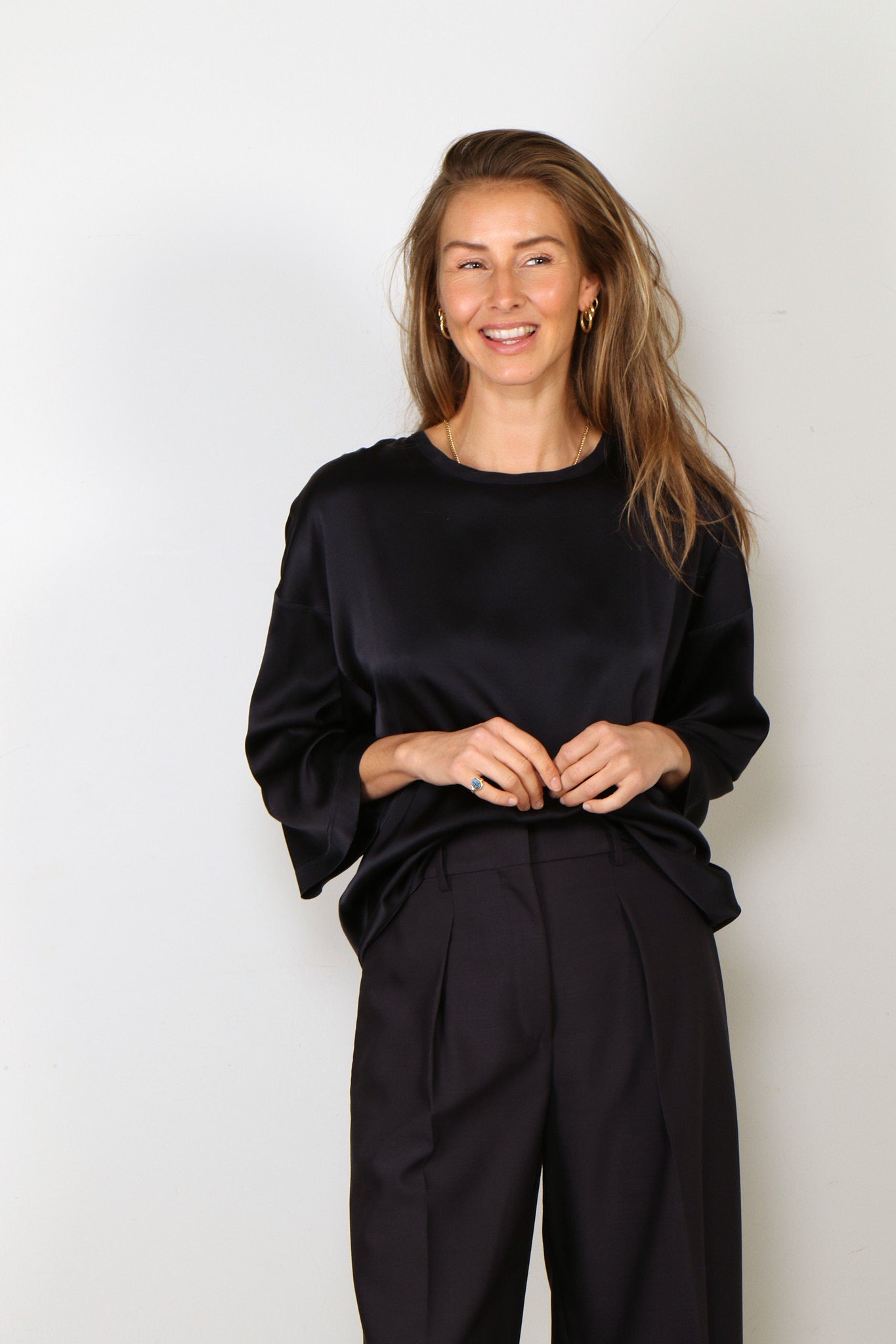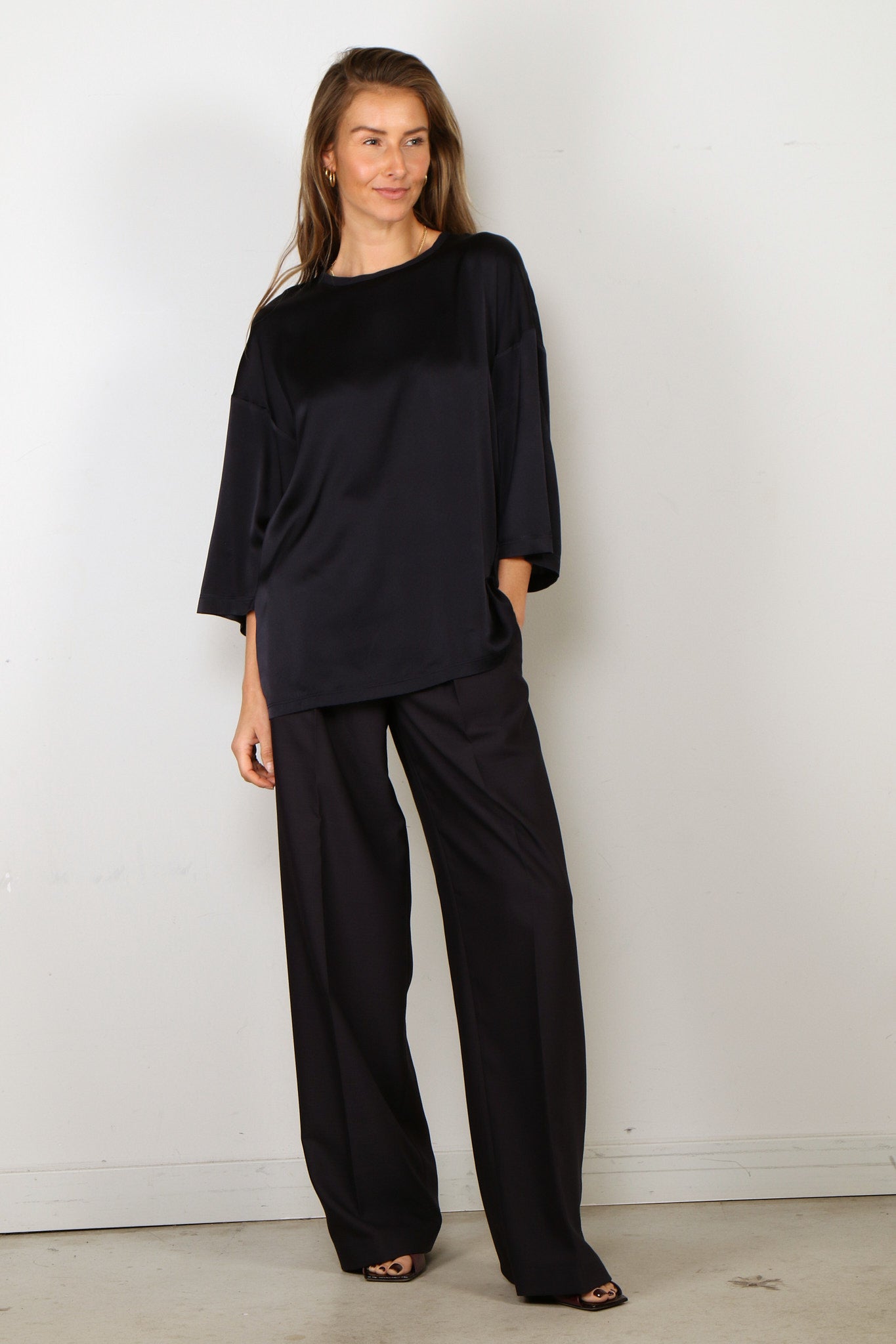 Forte_Forte T-Shirt - Shiny Stretch Silk Satin Oversized T-shirt - Notte