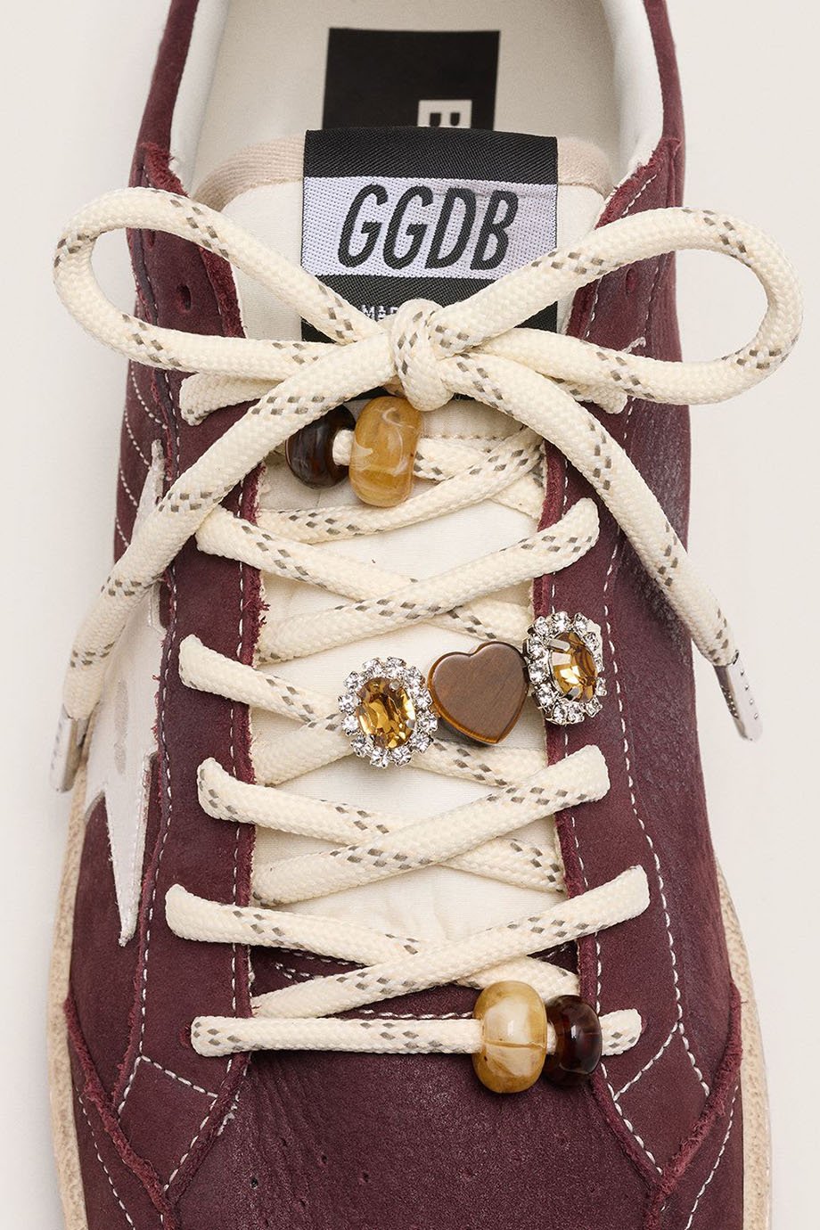 Golden Goose Veters - Skin Embellishment White Laces With Brown Beads Colored Crystal Studs And Heart Charm - Cream / Black