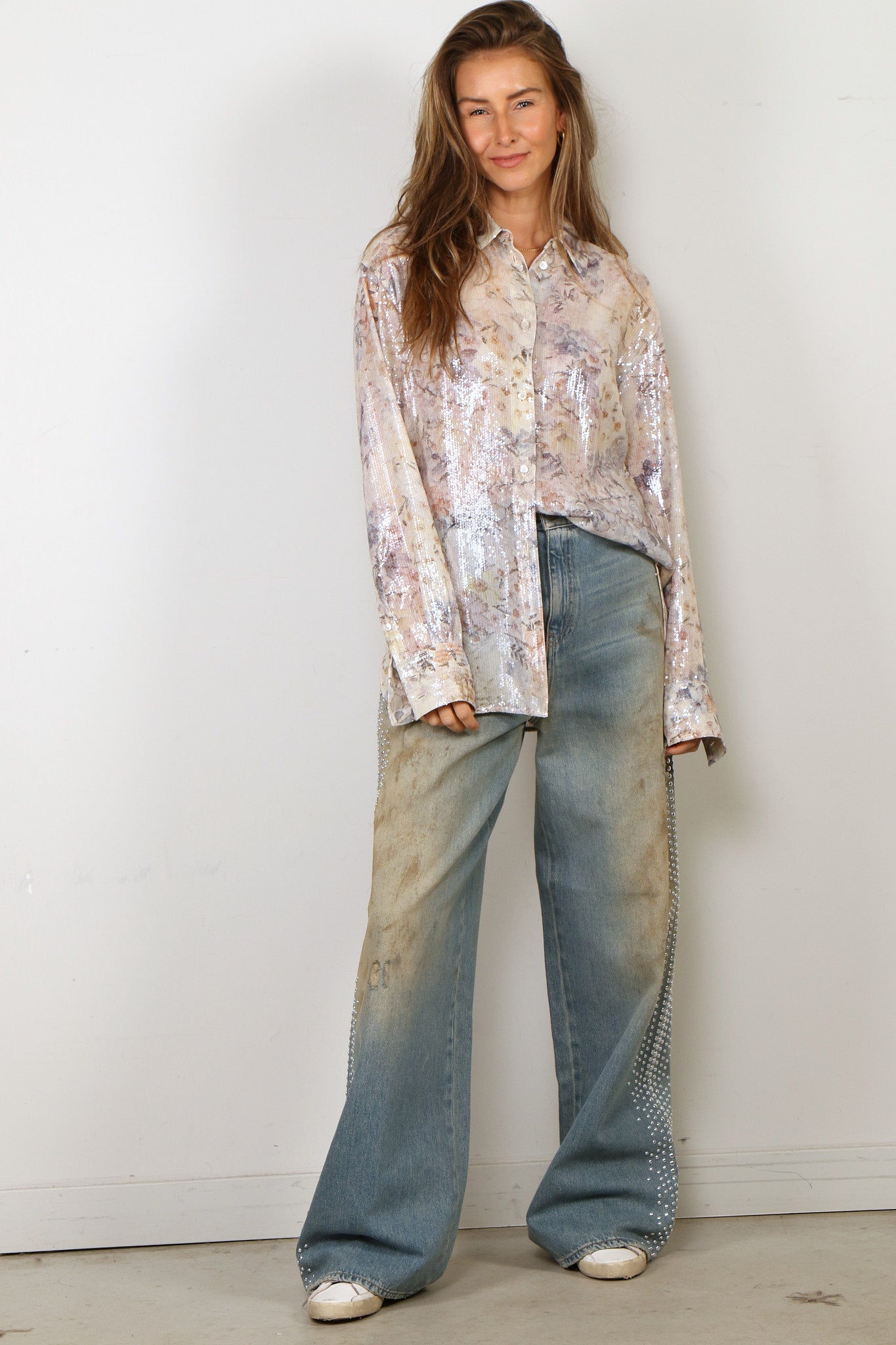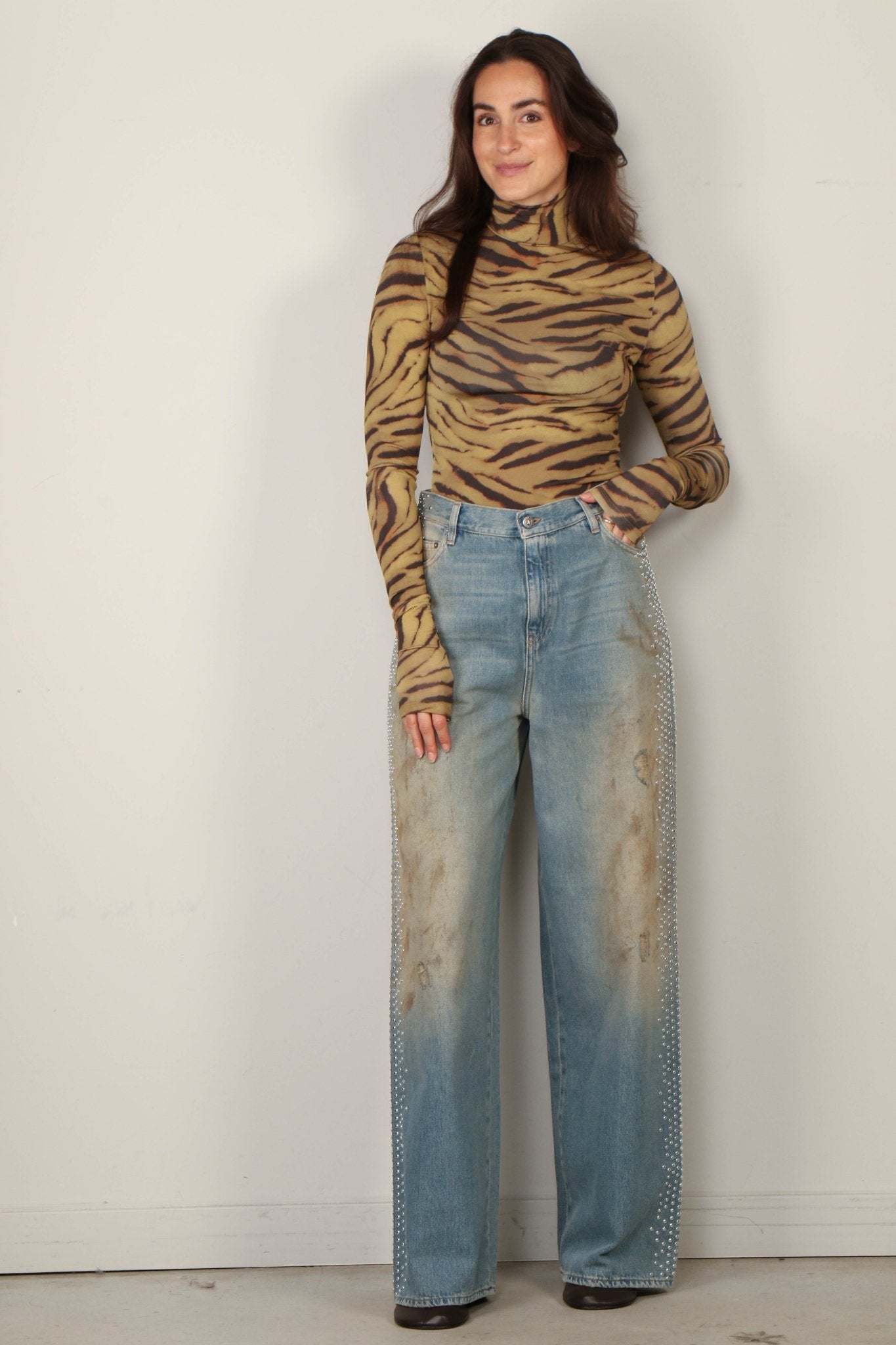 - Het model is 1.73m en draagt maat 28