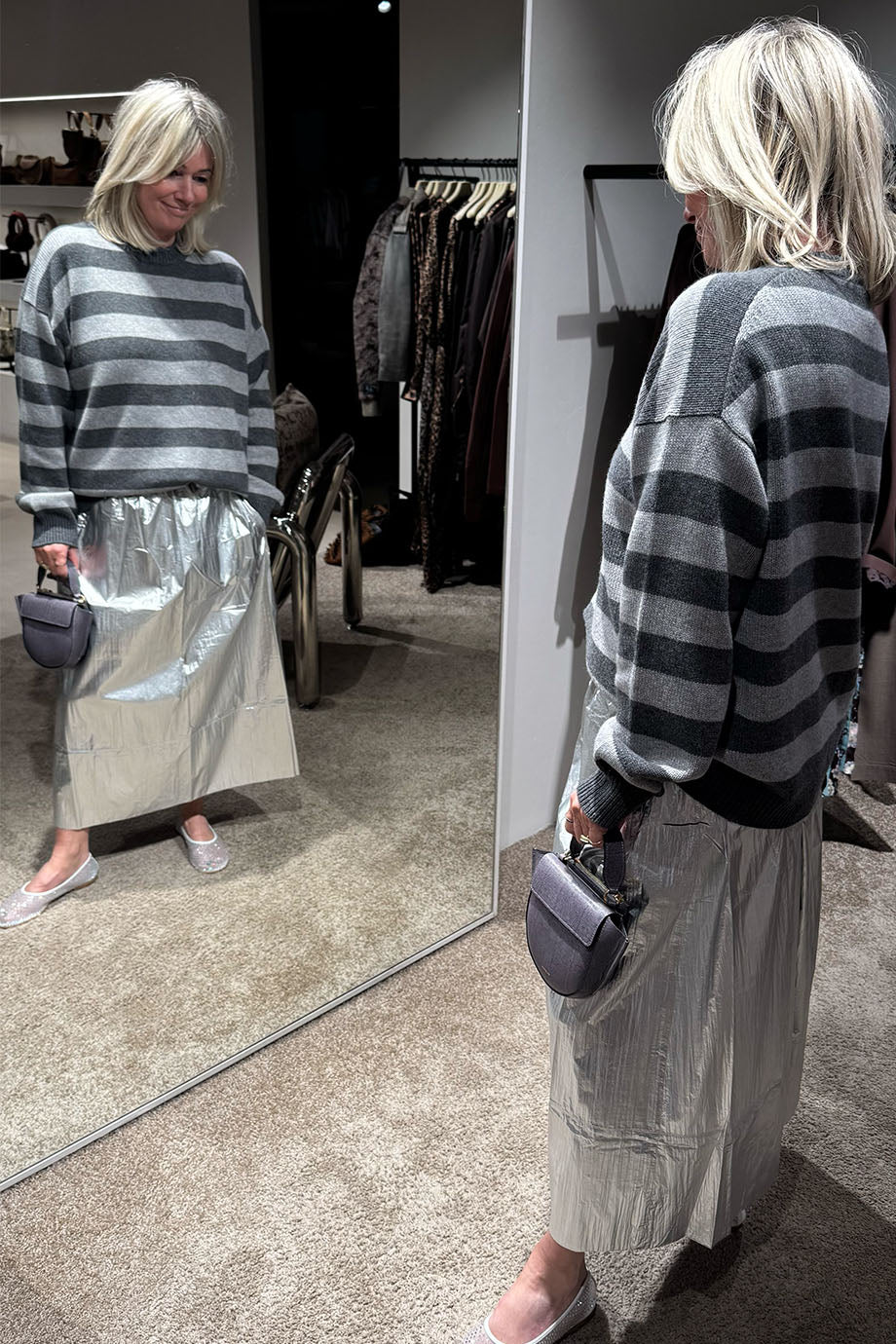 - Het model is 1.69m lang en draagt maat S